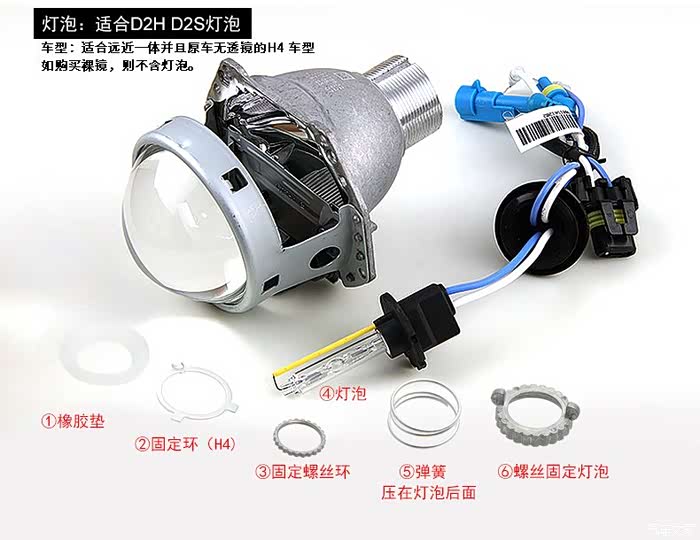 国产的仿海拉五的透镜。做工比较扎实。进口的海拉五或者q5透镜没有那种H4无损安装的。而且进口拆车件用的都是D1S D3S的灯泡。那种灯泡也比较贵,拆车的150-200一对。在这里提醒各位车友,如果改透镜的时候改装店或者网上商家告诉你,他的货是进口全新的,或者纯进口的拆车(海拉五或者q5)无损安装透镜,来借此要高价,还是转身走吧