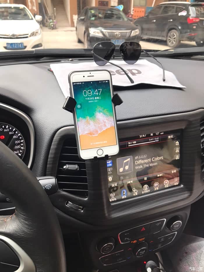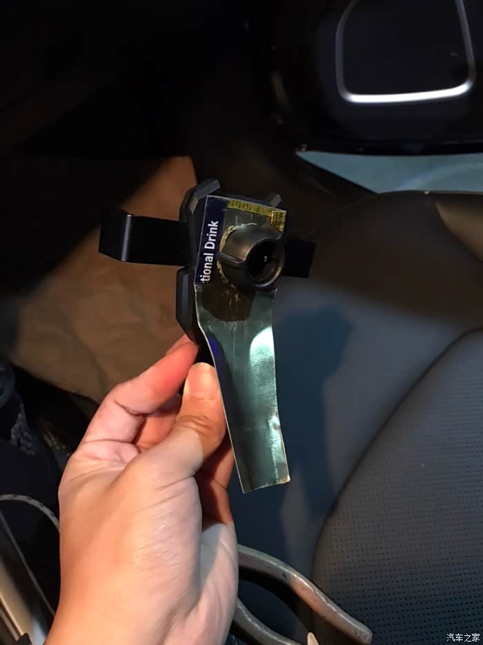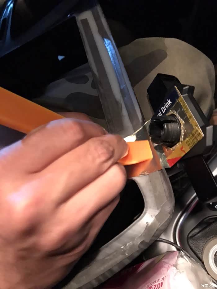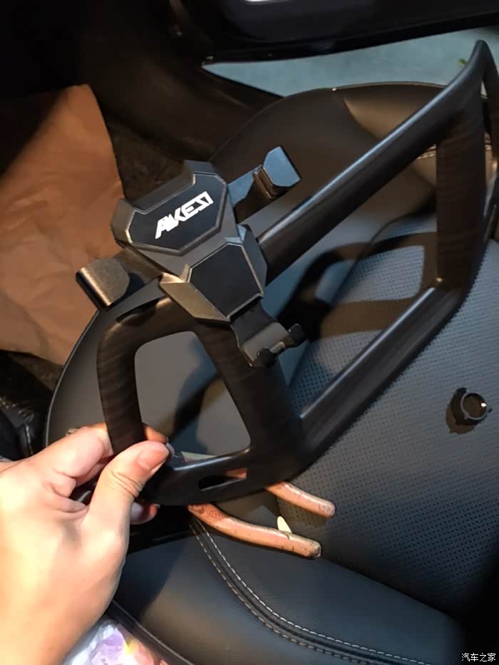 看网上有夹在这里的支架,但是要原车没有加装饰面板的才能用,所以突发奇想,又从后备箱把手机支架找出来,旧物改造。