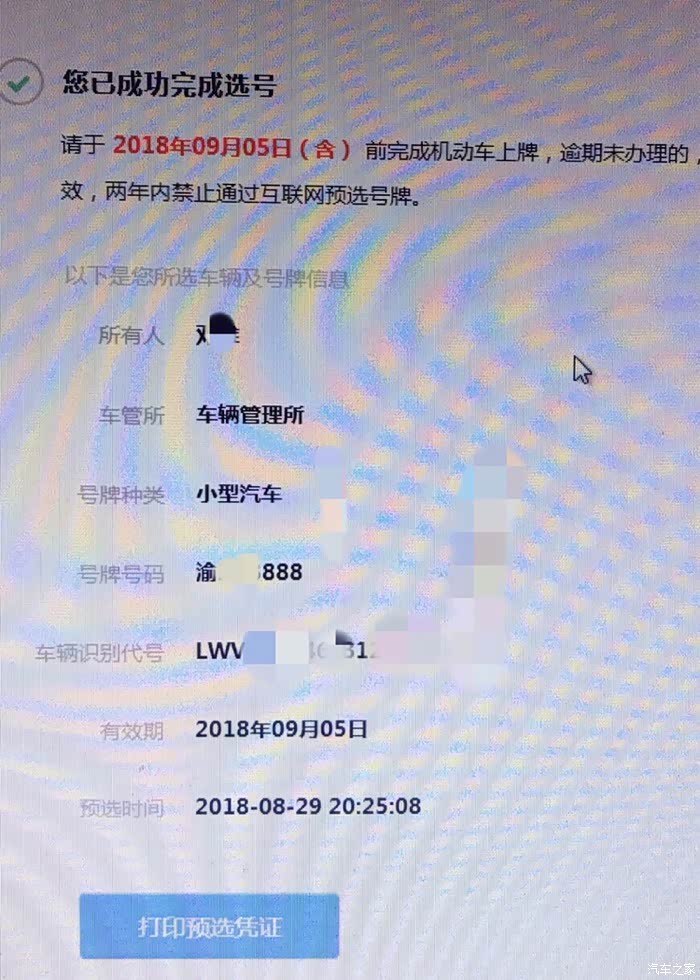 提车当天晚上到家在电脑上选号,自编号50个全没中。最后使用了随机抽取,到最后一次机会,喜提888!