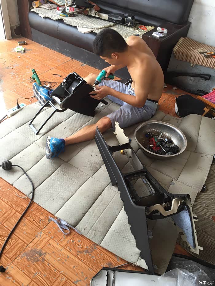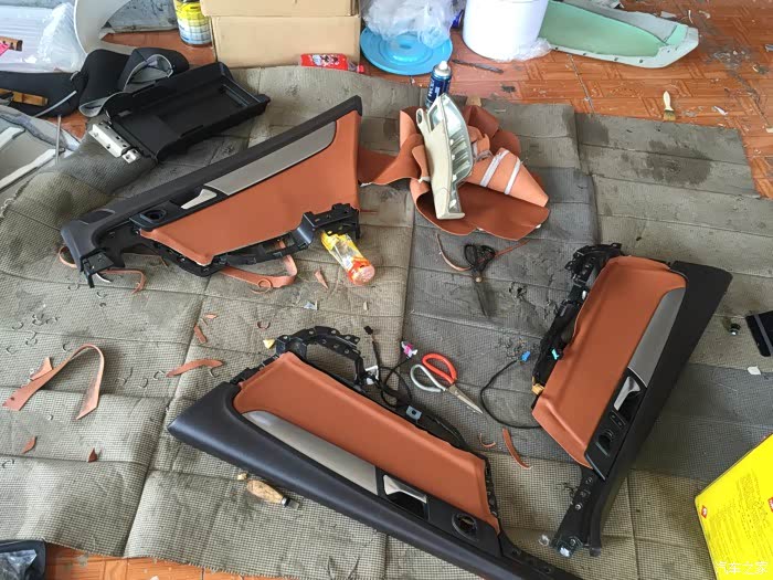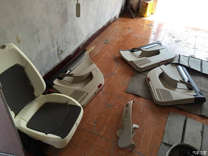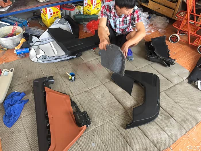 这些活一共做了两天,从拆车,到换座椅皮,干的很仔细也很卖力,很感谢这些小伙子和小妹。老板娘也觉得很好看,拿出手机拍了几张。还有,车上的一些塑料制品,找了个地方去烤漆,有一些地方在装车的时候发生了碰撞,有点掉漆,不过老板说可以再返工,把掉漆的地方重新补一下。喷漆是因为如果换原厂件的话,手里资金不够,烤漆质量也不错,如果有掉漆的地方,可以随时去补,跟喷漆的那个老板比较熟,保终身的。