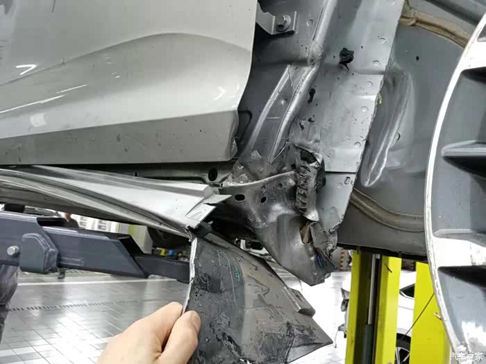 事故第一现场,轮毂脱落,没有侵入乘员舱。纵梁有些弯折,虽然撞击力度很大,但没有伤及发动机和变速箱。