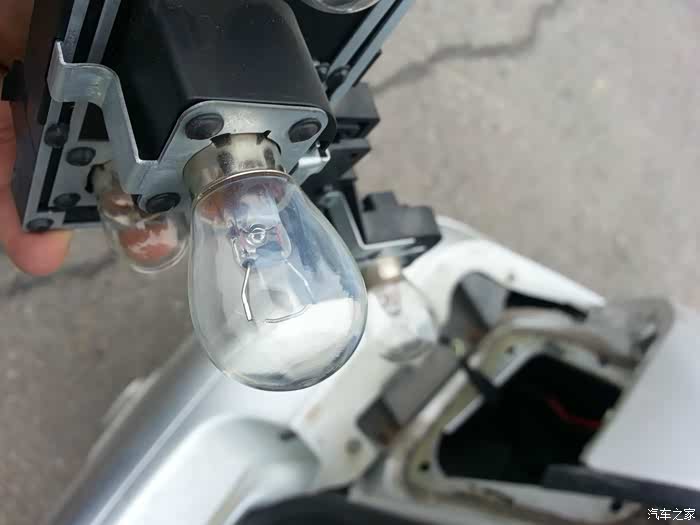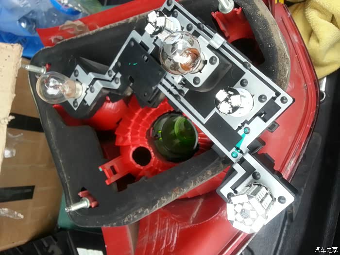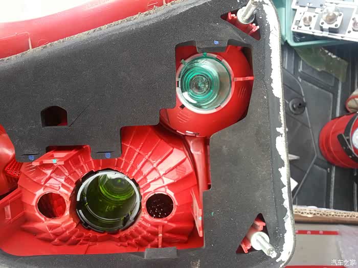 由于原来的倒车灯灯泡是黄色卤素灯,所以灯罩里有一个绿色的小灯罩,把黄光转换白光,我要换的LED是白色的,所以要把这个绿色灯罩取掉,灯罩取下来忘拍照了