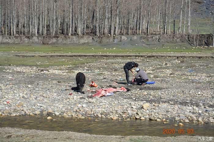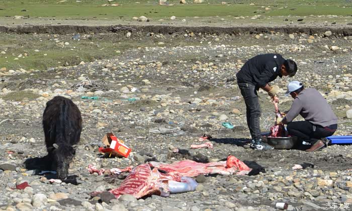 恰好遇到河对岸有人在杀牛。这个场面最令人诧异的是:旁边一个牛,不知在干什么?放大以后发现它在啃牛蹄子。个人猜想:有可能被宰杀的牛是旁边这头牛的母亲,小牛闻着熟悉的味道,却找不到母亲原来的样子。