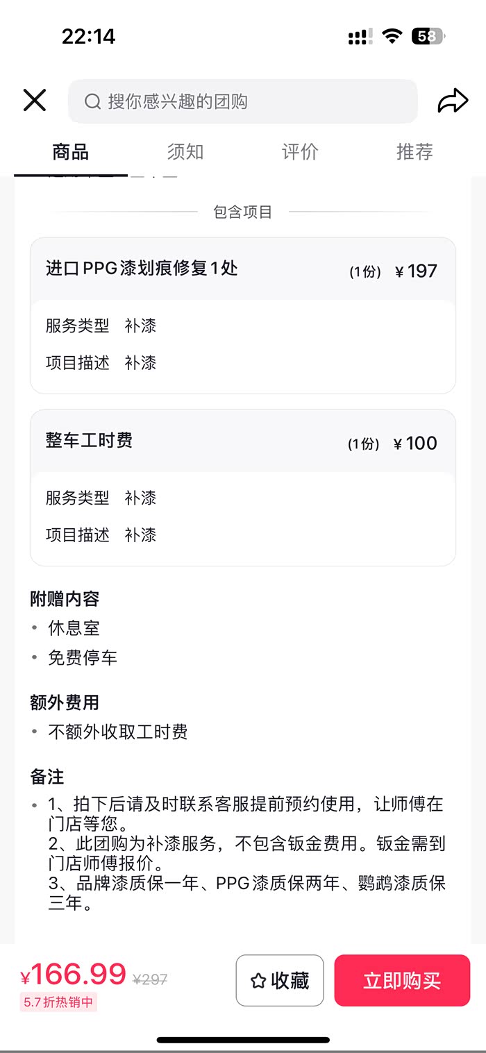 解决方案:因为就是底部的一点点划痕,也是塑料件,就想着1-200弄一下就行了,然后就在抖音上面找局部补漆的店铺,因为以前也有了解过,所以很快就订好了祺快的补漆,是一个连锁店,但是也是第一次去,他们店铺有三种清漆,一个国产的99元就可以补,一个ppg的166,一个鹦鹉的200多,想着塑料件,又在不明显的地方,也不需要用太好的,就选了一个ppg的清漆,质保两年,然后就打电话过去约了下午的时间,到店后服务态度还是不错的,接待也很好,我把问题描述以后就把车子交给他们了,因为里面一些油漆或工具,喷漆也是在专门的房间,所以就没有跟着进去了,但是我也交代了师傅,把隔离做好一点,别有那个飞漆飞得到处都是,大概两个多小时,车子就补漆好了,让我去看一下,当时看了还是挺满意的,没有飞漆,色差也是看不出,亮度也很亮,还是挺满意这100多的补漆。