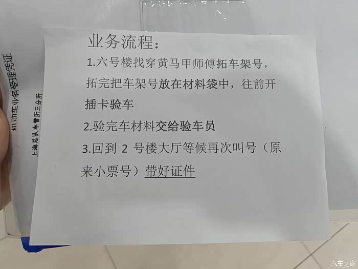 12点半左右到达三分所2号楼,刷身份证拿号,叫号后1-4柜台交材料车辆信息核对→给一张验车卡和一个文件袋材料→开车去6号楼验车点准备好三角警示牌和反光背心→验车后继续去2号楼大厅等叫号→确认网络选号或去机器上选号→交费120等大约20分钟在6号窗口取行驶证和牌照→最后回6号楼找师傅安装完牌照,整个流程大约1.5小时