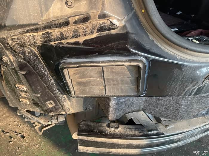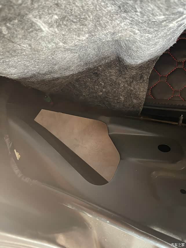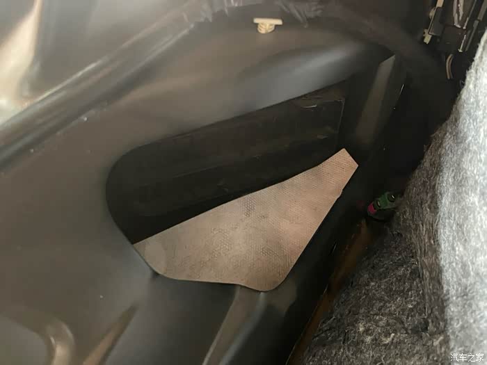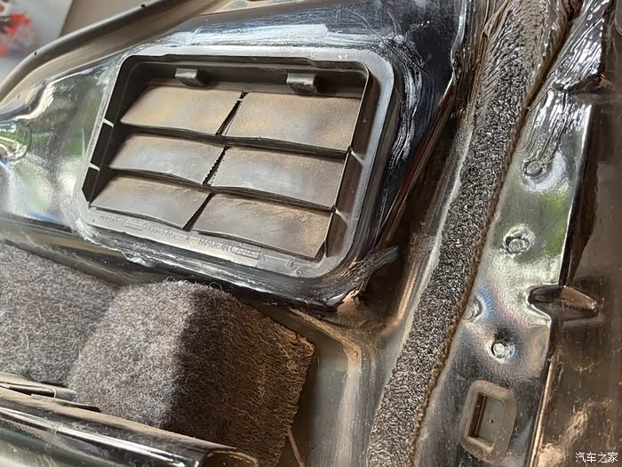 把水擦干后,往后备箱上面的导水槽倒水,倒一桶左右,就发现下面有水了,就是这里漏水,左侧通风口,里面有块白色的吸水棉,查看的时候要拆开后备箱内饰板,而且把后备箱最后面的,那块塑料板拆下来,一共拆4个螺丝,内饰板左右各一个,塑料板两个,第一次拧不太好拧,老虎钳逆时针旋转就行。