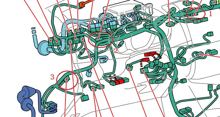 接好IG+,我们再来看看CAN线在哪里。这里需要说明一下,原厂对CAN线的要求是双绞线,论坛有车友购买的OBD接口的CAN线貌似是平行线,抗干扰能力比较弱,最简单的方法就是从网线中取出一对双绞线来用就可以了,我是直接购买的带屏蔽层的双绞线,实际上也没有必要,呵呵。CAN线在车身的接线位置并不像锐志一样在副驾驶手套箱附近,而是在仪表盘后面的“F62 1号CAN接线连接器”这是一个22针脚的连接器,其中1—11为CANH、12—22为CANL,而且在连接器上CANL线全部为白色线,很好分辨。F62的位置下手位置非常狭小,而且用胶带绑在线束的下面,不仔细看不容易发现,需要剪开胶带将它拿上来就好操作了。不好意思,这个没有拍照,拆开仪表盘上方的盖板,仔细找就可以发现,上一张位置图给大家参考一下。途中标有1号的圈内是IG+的F65 3号接线连接器,2号圈内就是F62 1号CAN接线连接器,3号圈内就是下面要说的SPD速度线的F66 4号接线连接器。