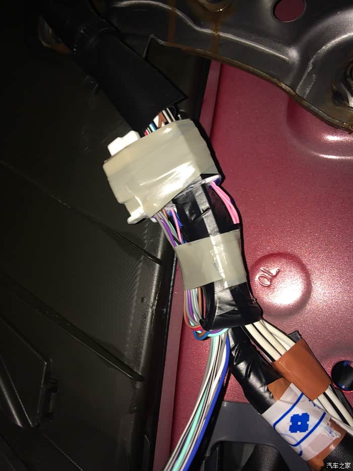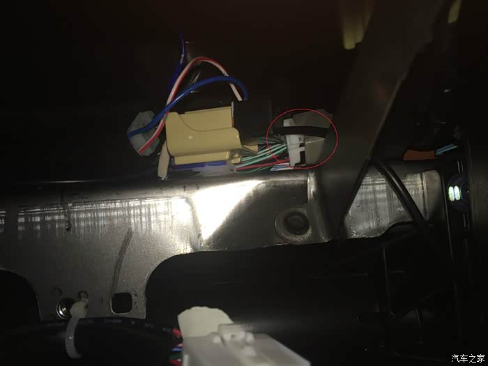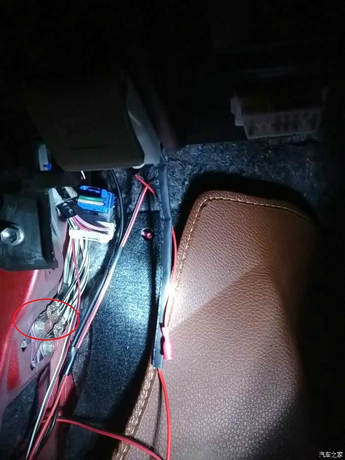 另外,车机28P的15脚PKB手刹线,我原打算接手刹开关上的,但是需要破线,所以依据我做的线束长度直接接到了OBD接口下方,A柱下饰板内的接地点上了,下图圈内的位置。这条线可以直接在车机后面找个螺丝固定在车身金属上即可,也可以直接拧到车机外壳上。