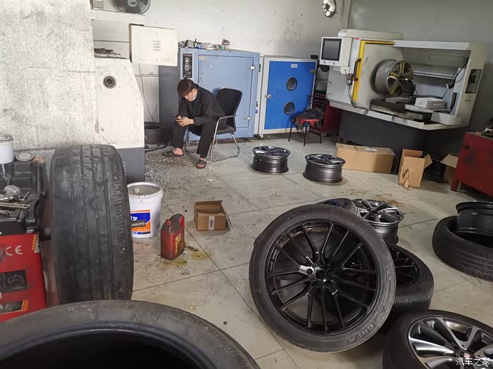 直接拉到轮毂修复店,早就想好翻新方案了,黑色不显大,所以准备改黑色拉丝