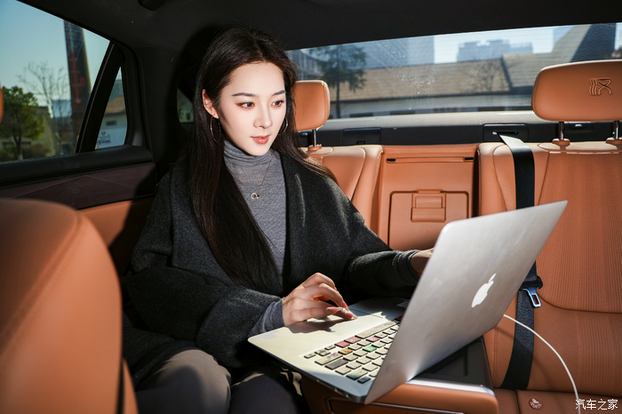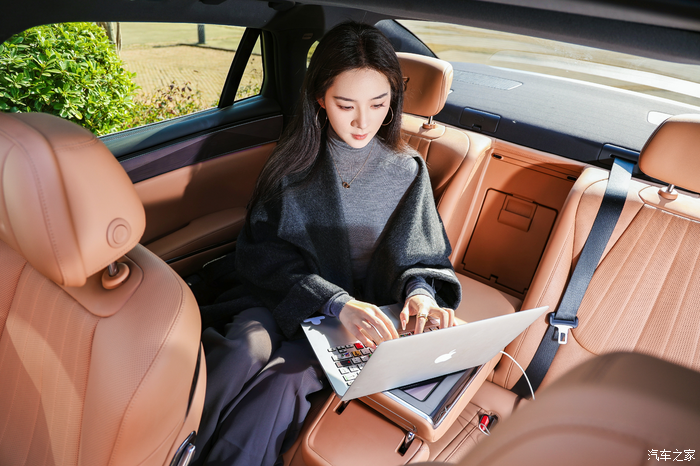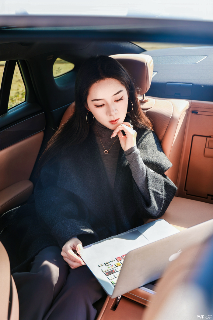 中午的太阳晒得人暖洋洋,回到车内,在车里处理会儿工作。后排空间是真的宽敞,我把腿伸直也没碰到前排座椅靠背,浅棕色皮质座椅的支撑感刚好,靠背角度调到舒服的位置,久坐也不觉得累。插上后排的220V电源,笔记本一接就能开工,车窗隔音效果很到位,安安静静就把活儿干完了。