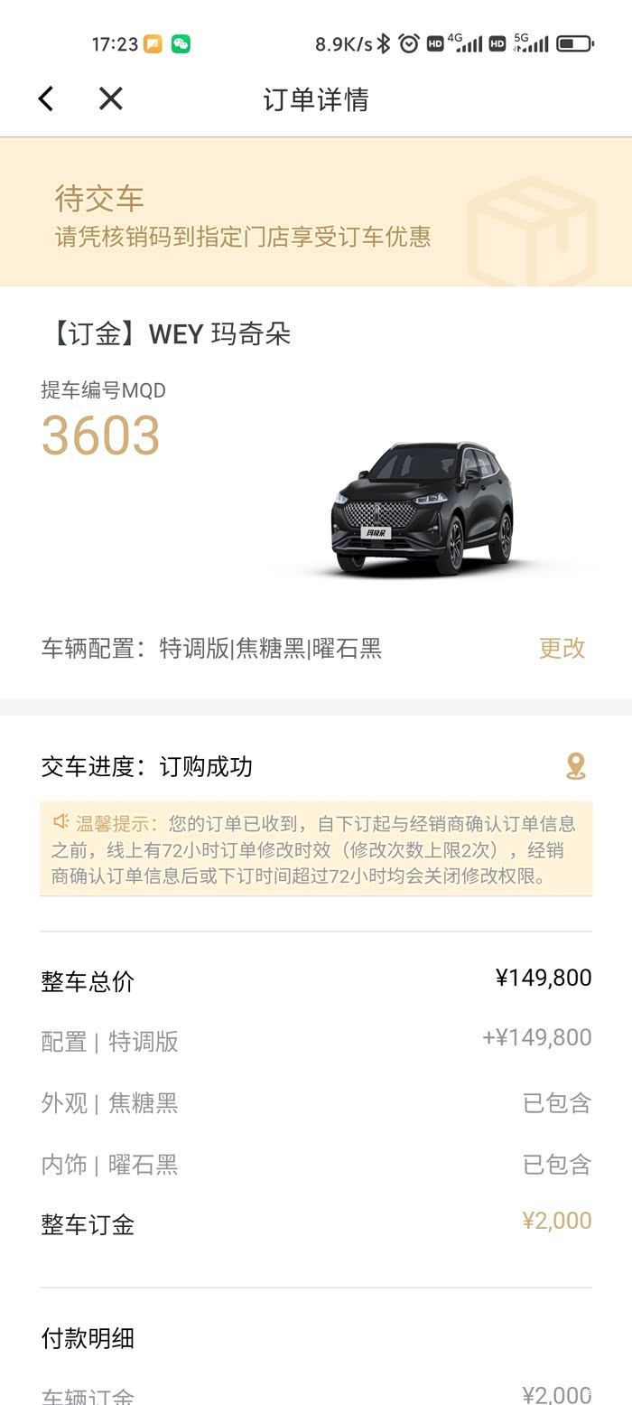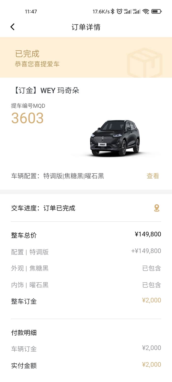 订车缘由:以前开的是丰田卡罗拉,卡罗拉这车还不错,没什么大优点,也没什么大确点,真的真的太平庸,开了一年多想换个SUV开,然后看了大概一个月,SUV油耗相对来说比轿车高很多,就决定换个油电混动的SUV,绿牌不绿牌无所谓,反正我这里充电桩装不了,先看了丰田威兰达混动,内饰真的有点烂,还贵,再看了荣威名爵吉利混动,反正缺点一堆,网上评价不高,比亚迪宋dmi也去看了,还是比较满意,就是销售告诉我提车时间4-6个月,立马劝退,然后到wey4S店,进店前我在网上是看了评测以及口碑,进店就试驾,然后销售告诉我有现车,我就来劲了,当天就订下来,第二天就提车了,那是相当快。