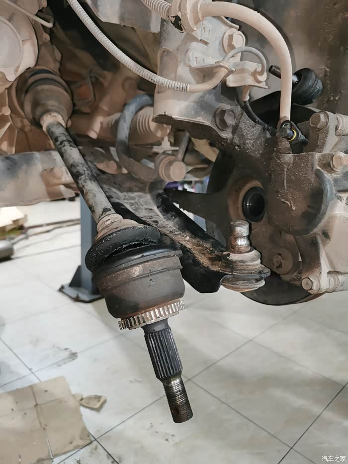 这是左边的半轴,已经严重球笼胶套破损。润滑脂摔的轮毂到处都是。