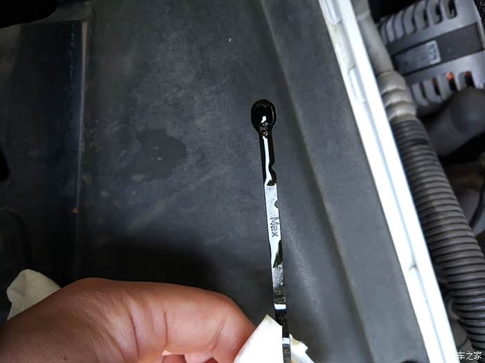 加完机油,打火5分钟,熄火检查,机油尺中线,还剩点300ml的样子,跑个2000公里检查下,少了加点