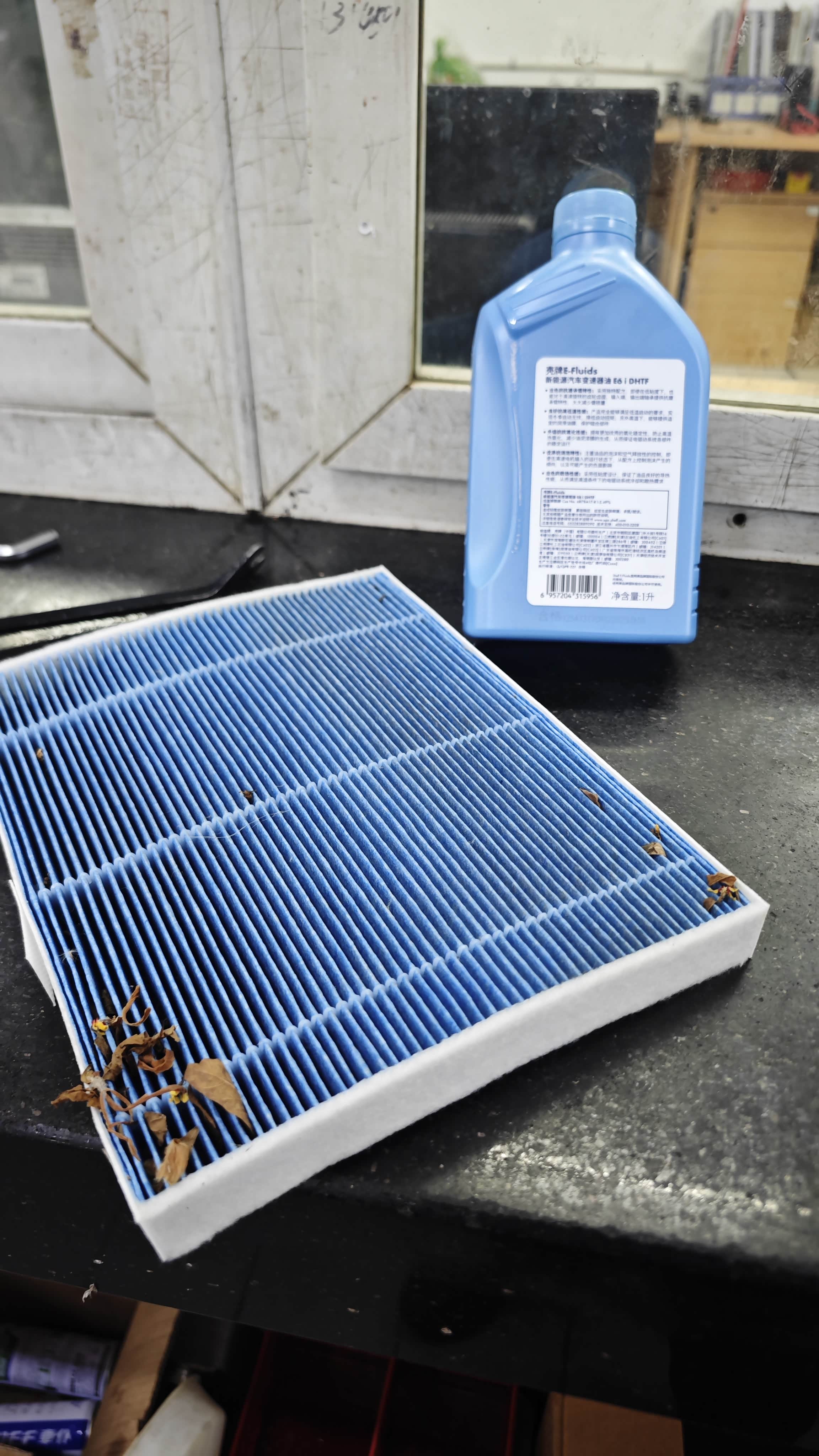 3、空调滤芯更换。副驾手套箱后面的旧滤芯沾了不少灰,甚至还有树叶碎渣,师傅拆下来换了新的。整个过程看起来比较简单。