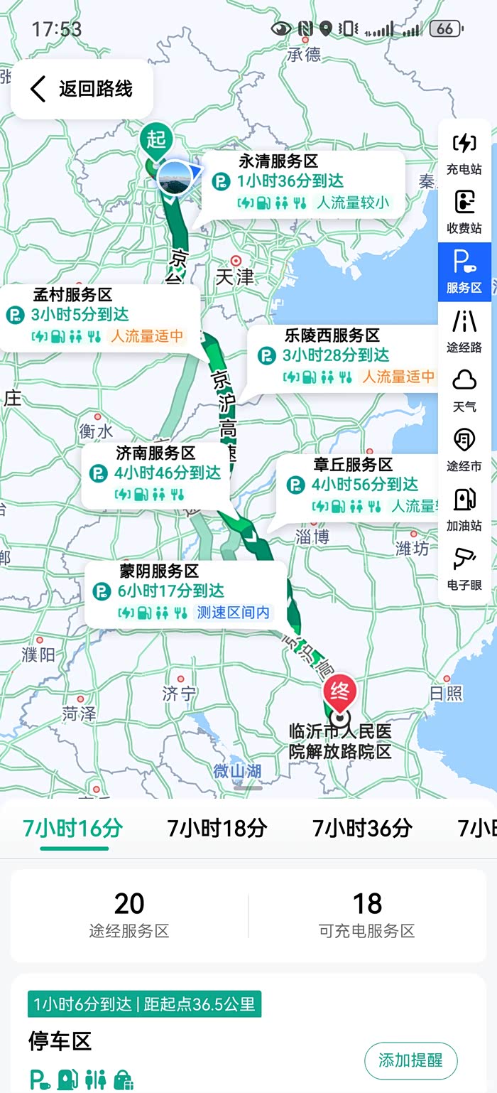 以我这次国庆出行为例,全部行程700km,先在导航软件上找到个300km左右充电桩较多的服务区,这就是补电服务区。