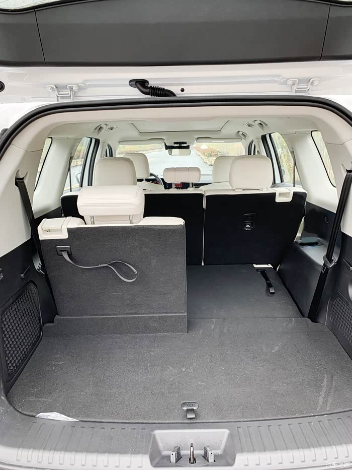 星途VX 这个后备箱是真心大,站在后排,手基本够不到后排座椅,拉货刚刚的,这也是大车的绝对优势了,坐着舒服,拉货一流,后备箱在7座模式下后备厢容积为450L。内部空间平坦,并带有12V电源。尺寸方面,进深:440-2100mm,宽度:1090mm,高:800mm,开口离地高度860mm。七座模式下,后备厢可以横置一个28英寸行李箱,对于七座SUV来说表现不错。