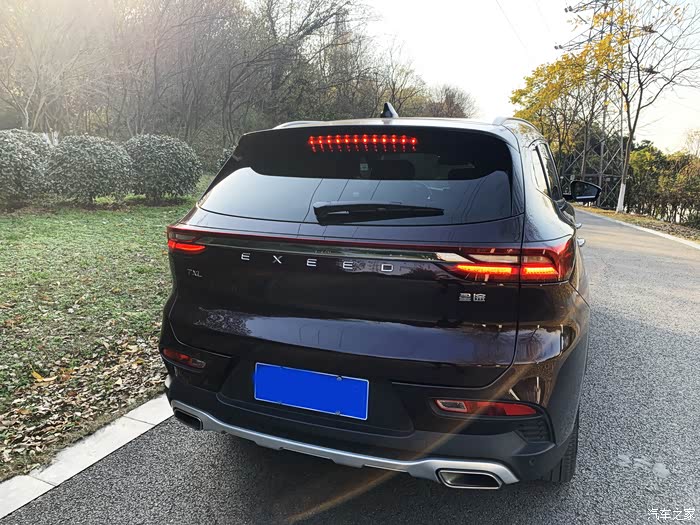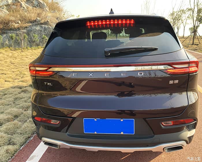 TX车尾也采用了贯穿式设计,并配有镀铬饰条装饰,尾部原先中间的奇瑞LOGO被改为了字母EXEED,整体感觉更加时尚,后雾灯和双排气设计使得尾部整体厚重而饱满,增加了车身整体视觉宽度。