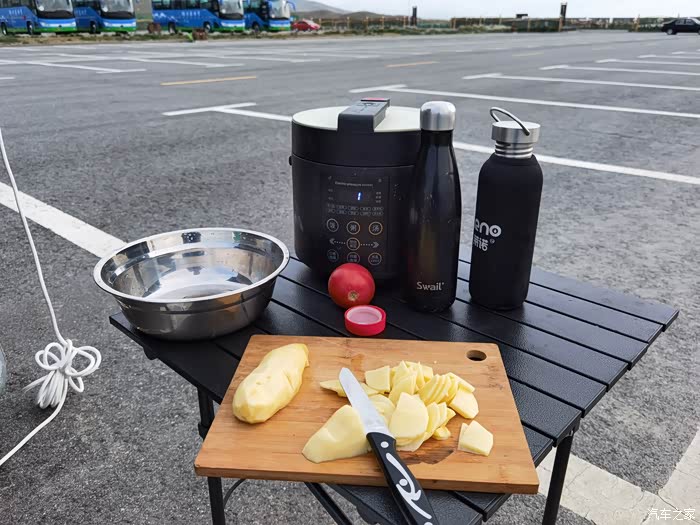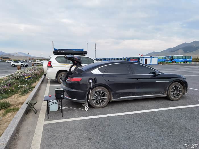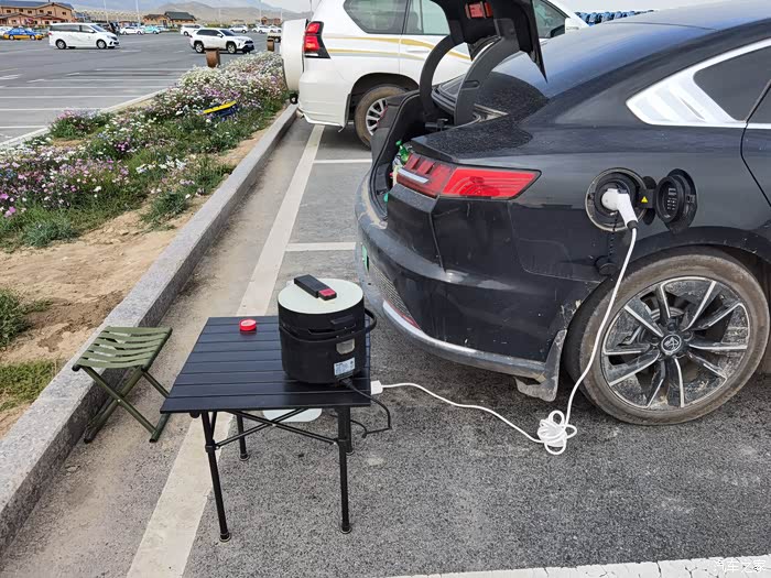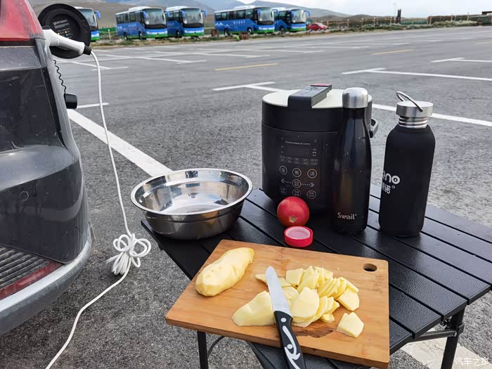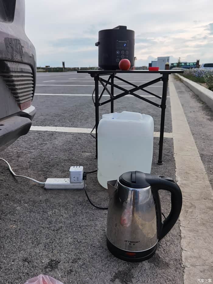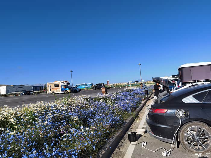 用水我都是上大的卫生间去接水用,接水还是相对方便的,我就计划在赛里木湖停车场驻车两天左右,主要是来到了这里感觉特别的凉快,水和卫生间都很方便,在这里每天都有很多的自驾游的车友来这里驻车,做饭也很方便,我最喜欢的功能就是这个车辆的外放电的功能,是我使用频率最高的功能之一,对方放电3.3千瓦,能持续稳定的输出,内车也能放电2.2千瓦,车内功率比车外稍微低一点,但是在车内也不会用什么大功率的放电设备,平时也完全能满足我的使用需求了。