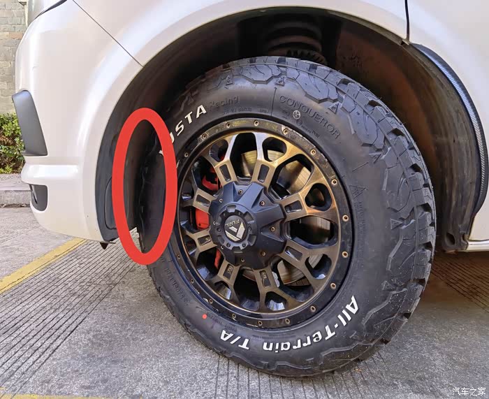 后轮 后轮眉与胎壁最窄处,约有1.5cm距离,刮擦不到轮胎。