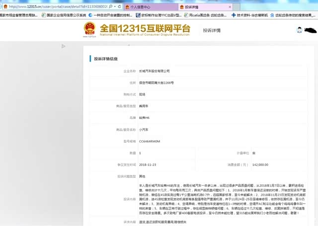 这两天发了个帖,主要是给大伙汇报一下我那新款换代哈弗H6的用车问题,现在把我上315的投诉给大家看看,内容大概是:本人自使用哈弗车一年多以来,从2018年1月7日以来,累积进场检查、维修共计十几次,平均每月两三次,具体质量问题如下:1、2018年1月新车首保还没做的时候开始发现该车严重烧机油,曾经在4S店实测过每1千公里消耗机油0.7升,远超国家标准,至今未能解决;2、2018年年底发现发动机底部漏机油,进4S店检查发现发动机底部有条裂缝导致严重漏机油,维修时换油底壳无效,两周后又依然漏机油,至今仍未解决;3、发动机有异响;4、空调异响,特别是当车变速档位在1~3档的时候,空调开AC制冷功能会有个呜呜呜像牛叫一样的声音;5、车辆在正常行驶过程中,存在明显换档顿错问题;6、车辆在经过十几次检查、维修、反复拆装后,不知道是否存在安全隐患。多次致电厂家400客服电话投诉,至今仍然未能处理