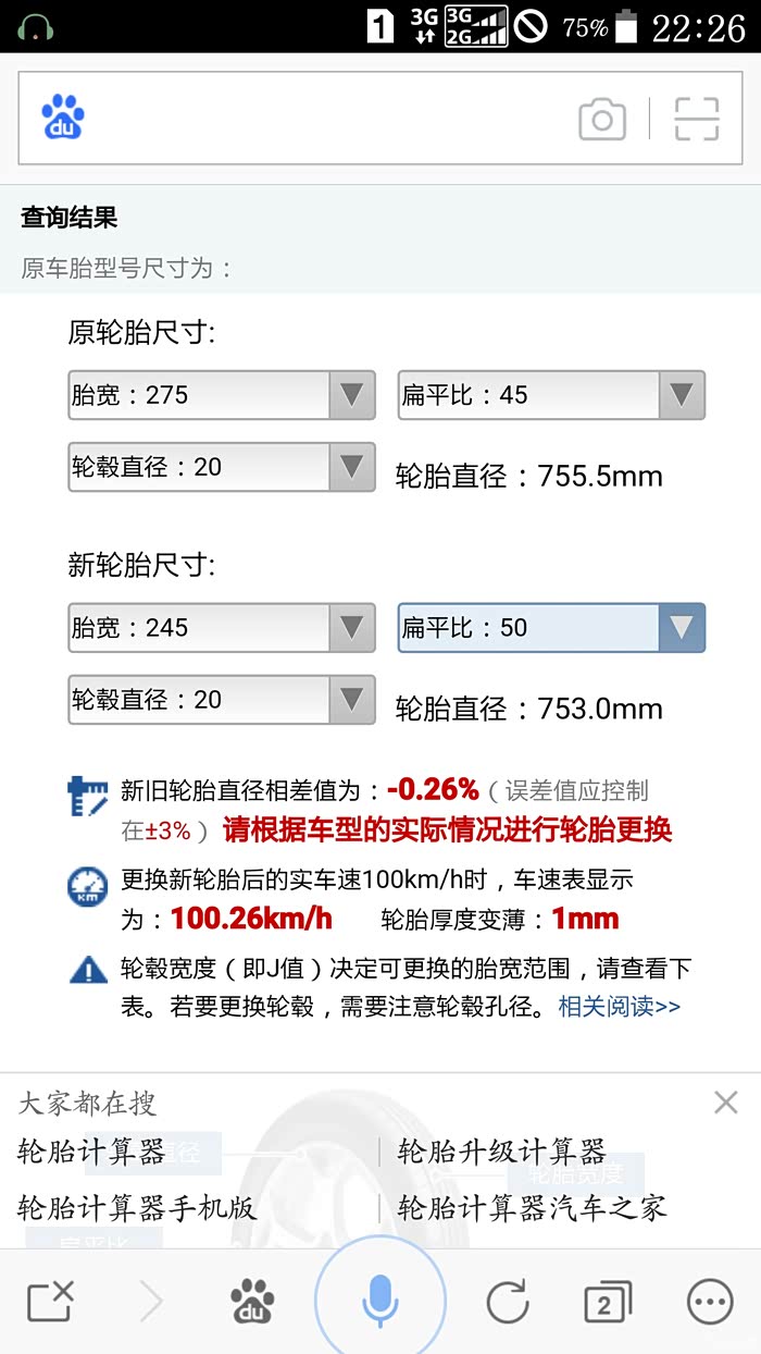 言归正传,小弟生活在北方山区,以为回厂里的路没有硬化,下午下雪只有厂里的一台长城皮卡能走,现在条件稍微宽容了些,实在想换台好点的,现在看好的那台途锐是275 45 20的,这个规格没有AT(全地形轮胎)胎,度娘上随便找了个轮胎计算器,看这个还行245 50 20,坛子里有没有懂的人,存不存在钢圈太宽的问题,可行性有多少?