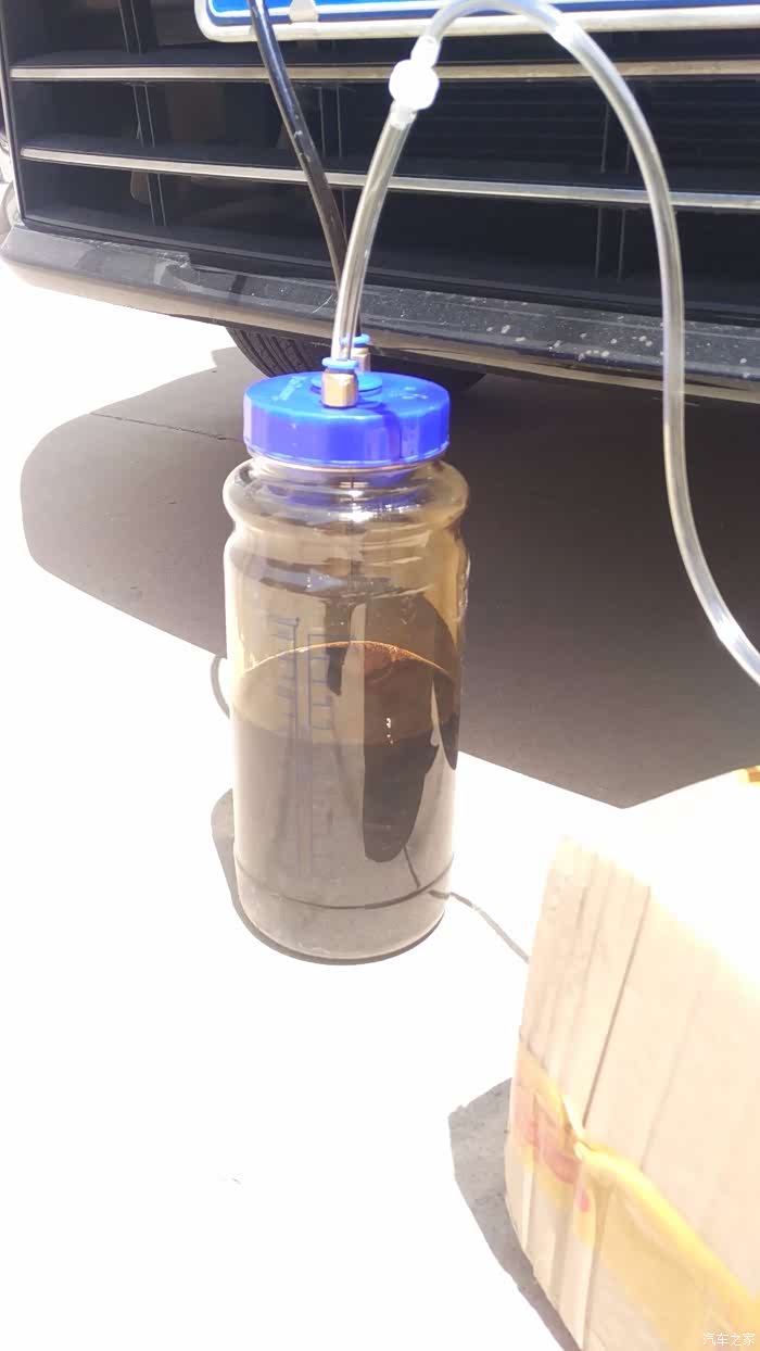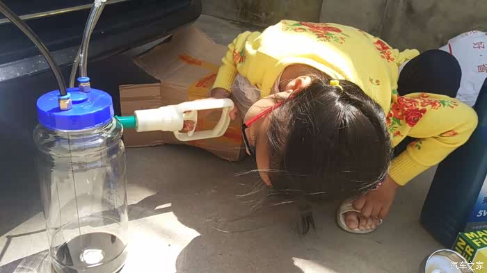 这时候可以把瓶子上面的管子拔出,拧开盖子,把旧机油倒入事先准备好的容器里,我这里拿了一个以前的空机油桶。旧机油不能随便倒入下水道哦,会污染环境的。然后再抽,当感觉抽完时可以上下移动一下插入机油标尺孔的管子,这样可以帮你判断是否是抽干净了。我把所有抽出的机油都倒入了原先的旧机油桶里,大概3升,应该是抽干净了,因为上次保养时就加了3升的机油。
