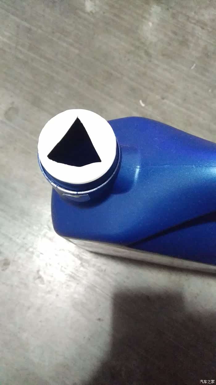 下面就要开始添加新机油了。发动机的机油家注口一般都不是很大,新机油又是满桶的,所以容易倒在机油加注口外面。这时可以用大饮料瓶割一个漏斗放到机油加注扣上,让你倒得既快又准,不洒半点在外面。可是大众的发动机机油加注口是半封闭的,漏斗用不上。好吧,那我就把机油瓶口的密封层割一个三角形的口,这样就容易控制机油的流速和流向了。