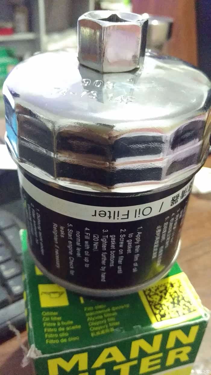 这时可以用机滤套头把旧机滤卸下来了。在装新的机滤之前先在机滤的密封圈上均匀的抹上机油,便于安装和将来拆卸。