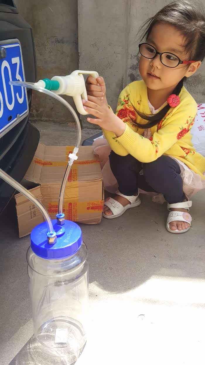 等油开始被吸入瓶里的时候就不要再抽气了,否则容易把这个瓶子吸扁了。过一段时间油流的慢了再吸气。如此反复,大概10分钟就能吸1.5升。