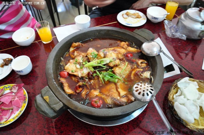 中午在县城一小店吃石锅鱼,味道不错。