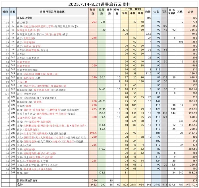 这次避暑旅行用时39天,行驶了4570多公里。按贯例将所有费用统计了一下,自己留存,也供车友们参考,费用共计14919.77元,其中:
