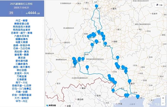 内江-赫章-赫章挂壁公路-阿西里西大草原-阿西里西韭菜坪-百草坪-威宁-草海-六盘水百车河-锅圈岩瀑布-乌蒙大草原-曲靖-彩色沙林-石林-乃古石林-抚仙湖-滇池-普者黑-鹅泉-渠洋湖-爱布瀑布群-三叠岭瀑布-靖西-德天瀑布-明仕田园-友谊关-东兴-万尾金滩-北海银滩-南宁-大化-吞榜天窗-七百弄-巴马-三门海景区-天蛾-安顺-织金-支嘎阿鲁湖-大方-宣慰府-毕节-内江