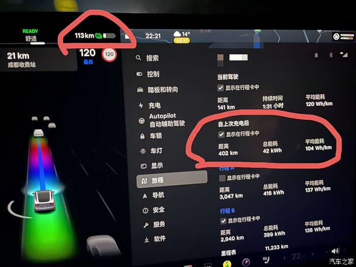 从西昌往成都赶,能耗真的是历史最低,跑了402公里,还显示有113公里续航。距离141公里,时间花了1小时31分,说明车速不算慢,能耗才120.