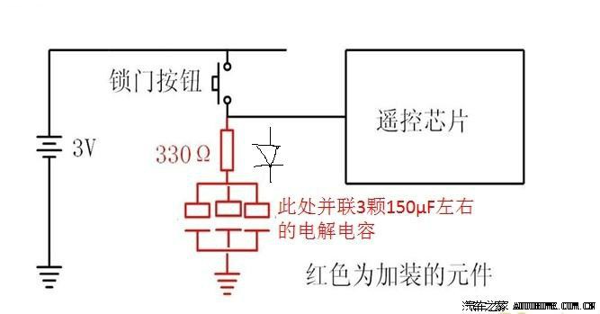 将330的电阻边上并个二极管试试,电容可以减到一个(加快电容充电到额定值)。还有就是能不能试下将电阻直接改为二极管,只能说先试试,如果遥控芯片里电路放电电流极小的话,应该可以实现,怕就怕长时间放不掉电,就好比锁门键一直按着,那就需要再减小电容了。