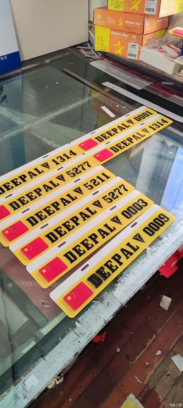 长春美丽的秋天到了,经过车友们的提议,我们自主设计了深蓝车友会的车牌副牌,经过大家的几轮讨论,最终确定的元素为:中国国旗+DEEPAL+深蓝标志+4位数字,做成3D立体副牌,大概的效果图如下。