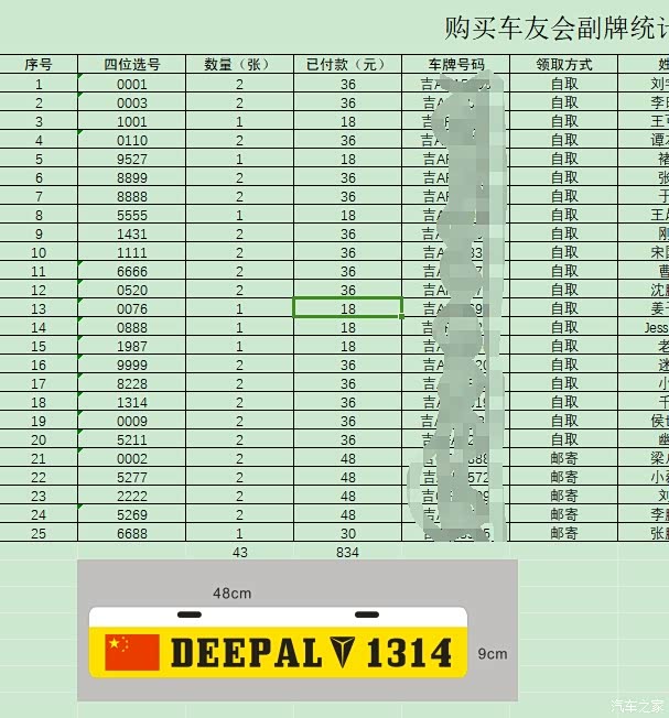 我们在网上和本地找商家进行了比价,最终在本地广告店里谈好以18元每张的价格,为我们批量制作,大家的热情特别高,通过小程序选号码,连远在白城的车友们都留下了地址,邮寄过去。