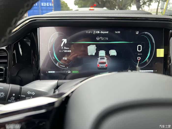 激活集成巡航模式后,仪表盘会进入巡航界面,还能在界面上显示周围车辆的位置和动态,同时在AR-HUD抬头显示上也会显示集成巡航相关的3个图标,以及检测到有前车时的绿色弧线提醒(没拍到,安全第一; 那么问题来了,集成巡航自动减速的时候,刹车灯是亮的么?