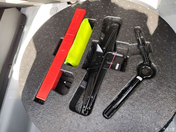 打开后备箱底板,看到备胎的随车工具,使用的是非全尺寸备胎。如果是全尺寸就更好了。隐藏工具箱,有备无患。
