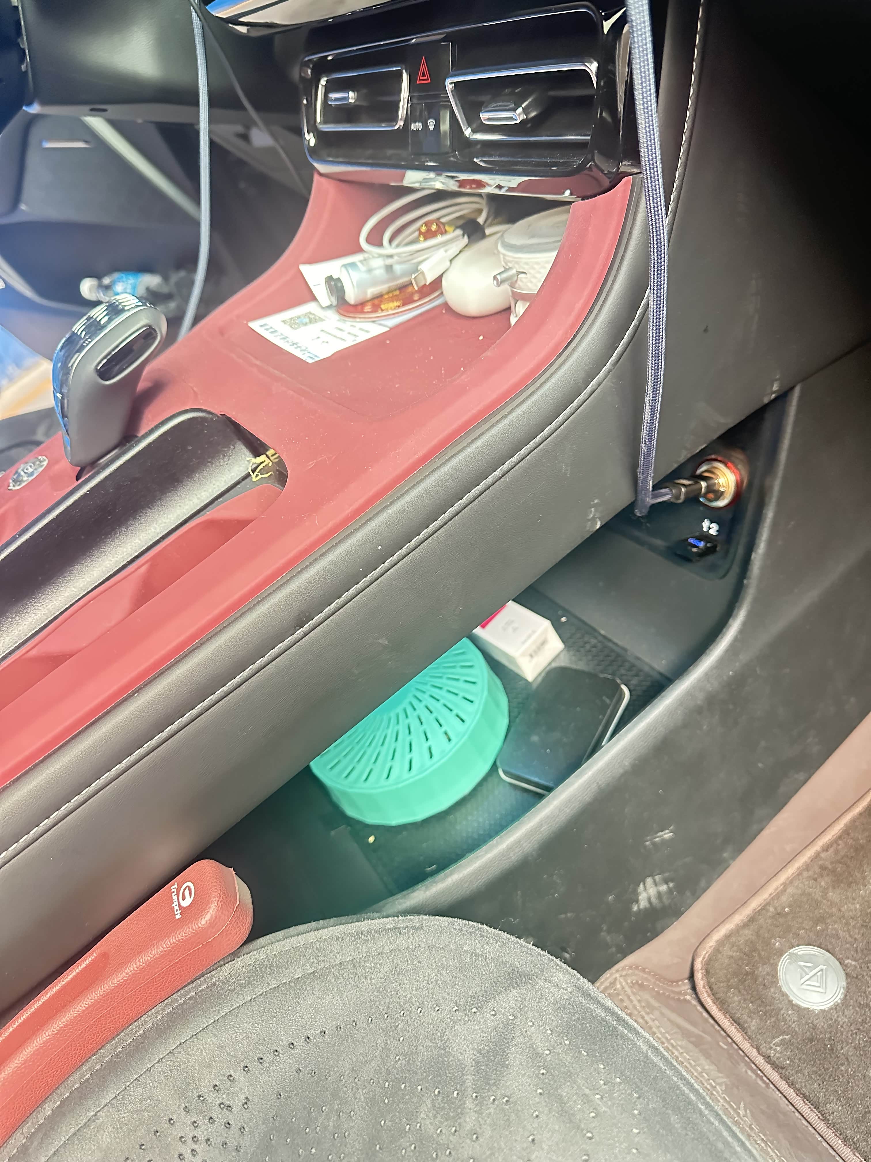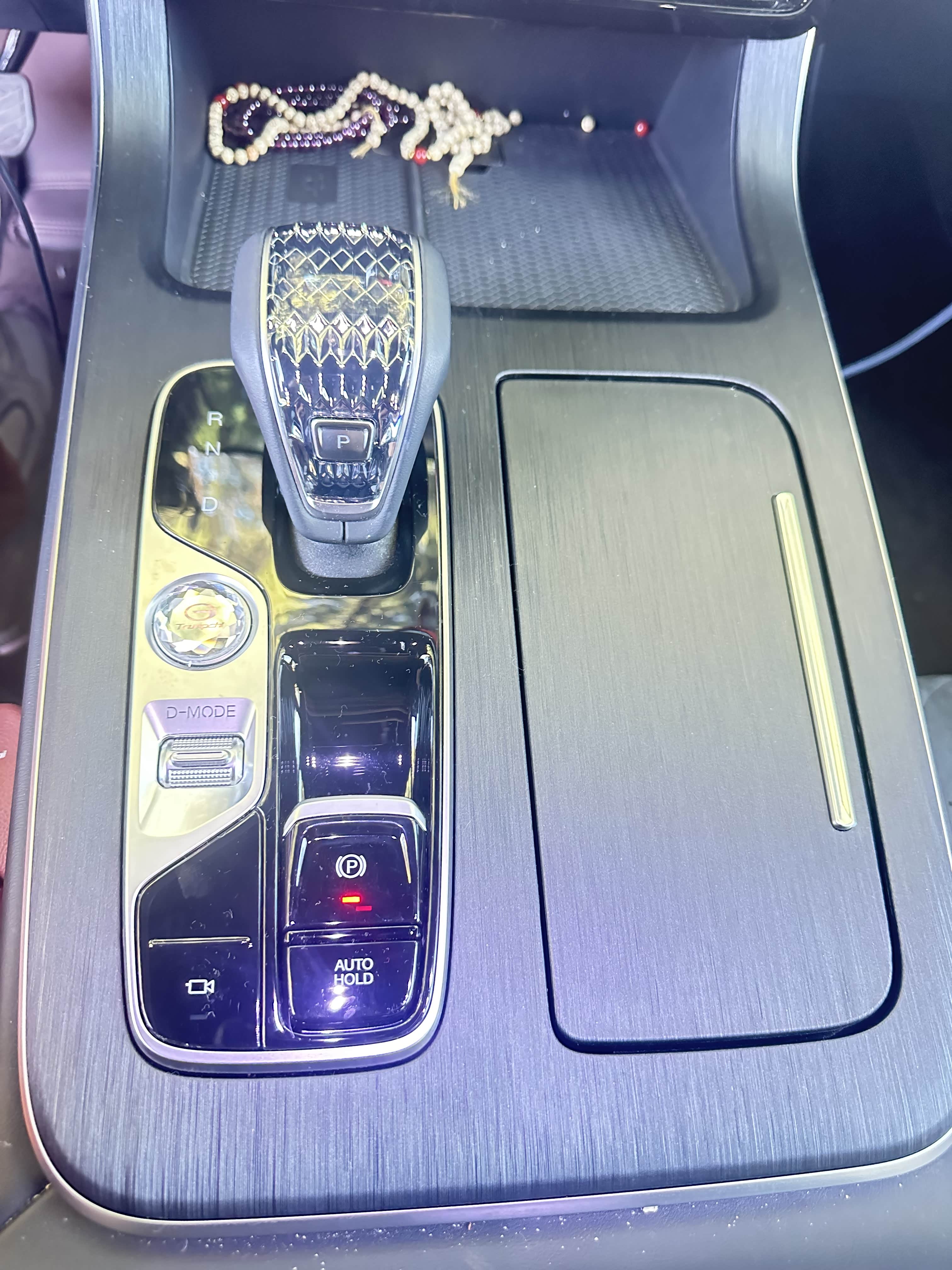中控台下方采用了掏空设计,形成了一个实用的储物空间,深度和宽度都不错,可以轻松放下我的手提包和一些日常杂物,拿取也十分方便。旁边还有两个Type-C接口和一个12V电源接口,满足了前排乘客的充电需求。电子换挡杆的造型小巧精致,换挡行程短,操作轻盈,每次换挡都伴随着清脆的“咔哒”声,带来了不错的仪式感。