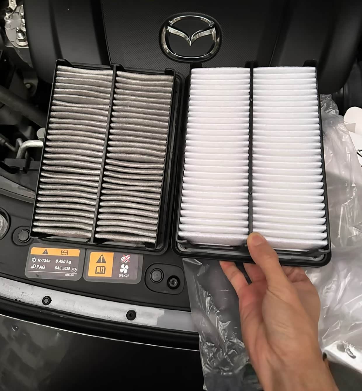 这个空调滤芯在手套箱里,往下一按就掉,装新的时注意箭头朝车尾;空气滤芯更简单,打开发动机舱的黑盒子,卡扣一掰就换,非常简单;这个我通常都是自己换,还可以节约几十块工时费,哈哈哈。
