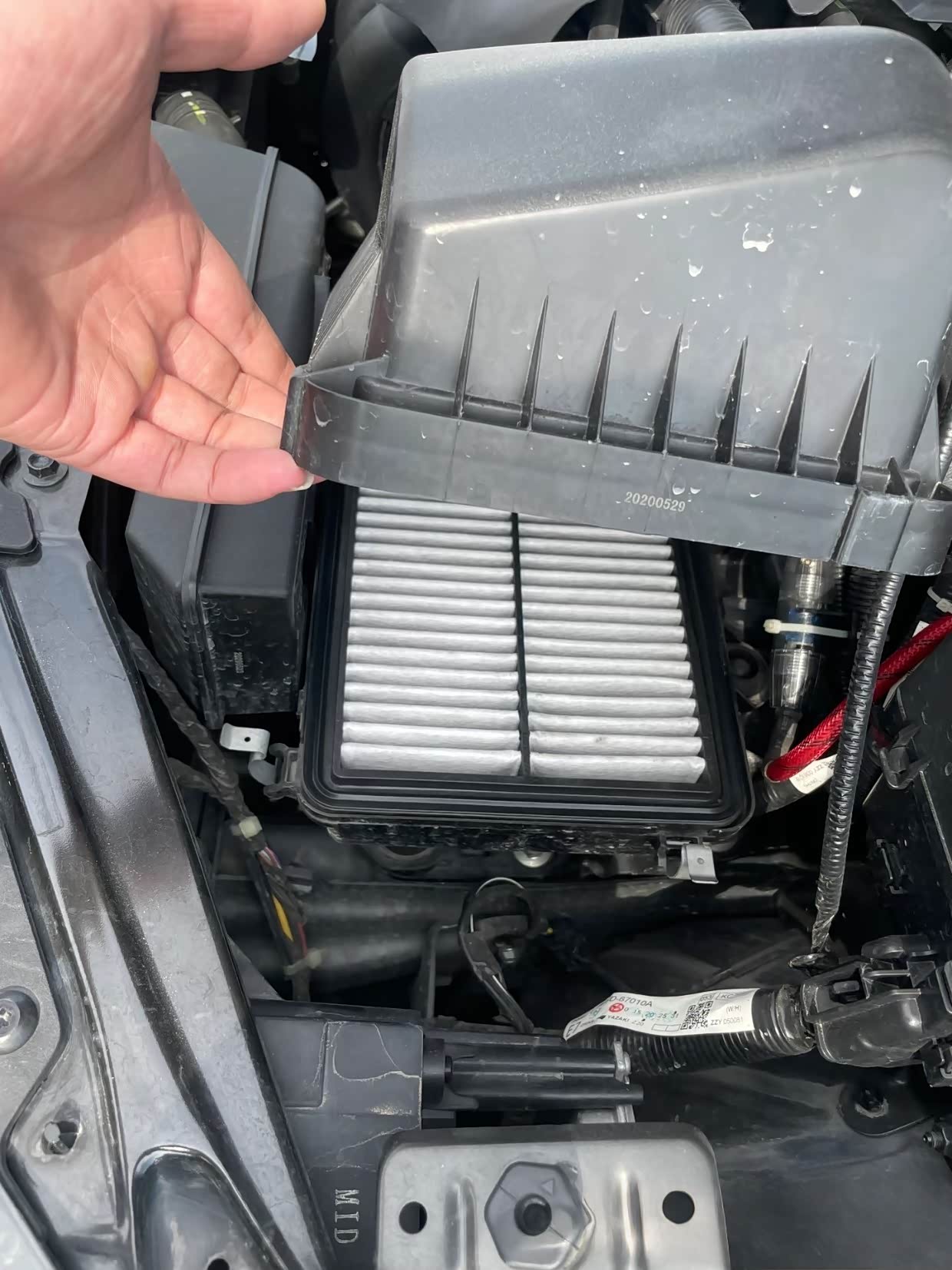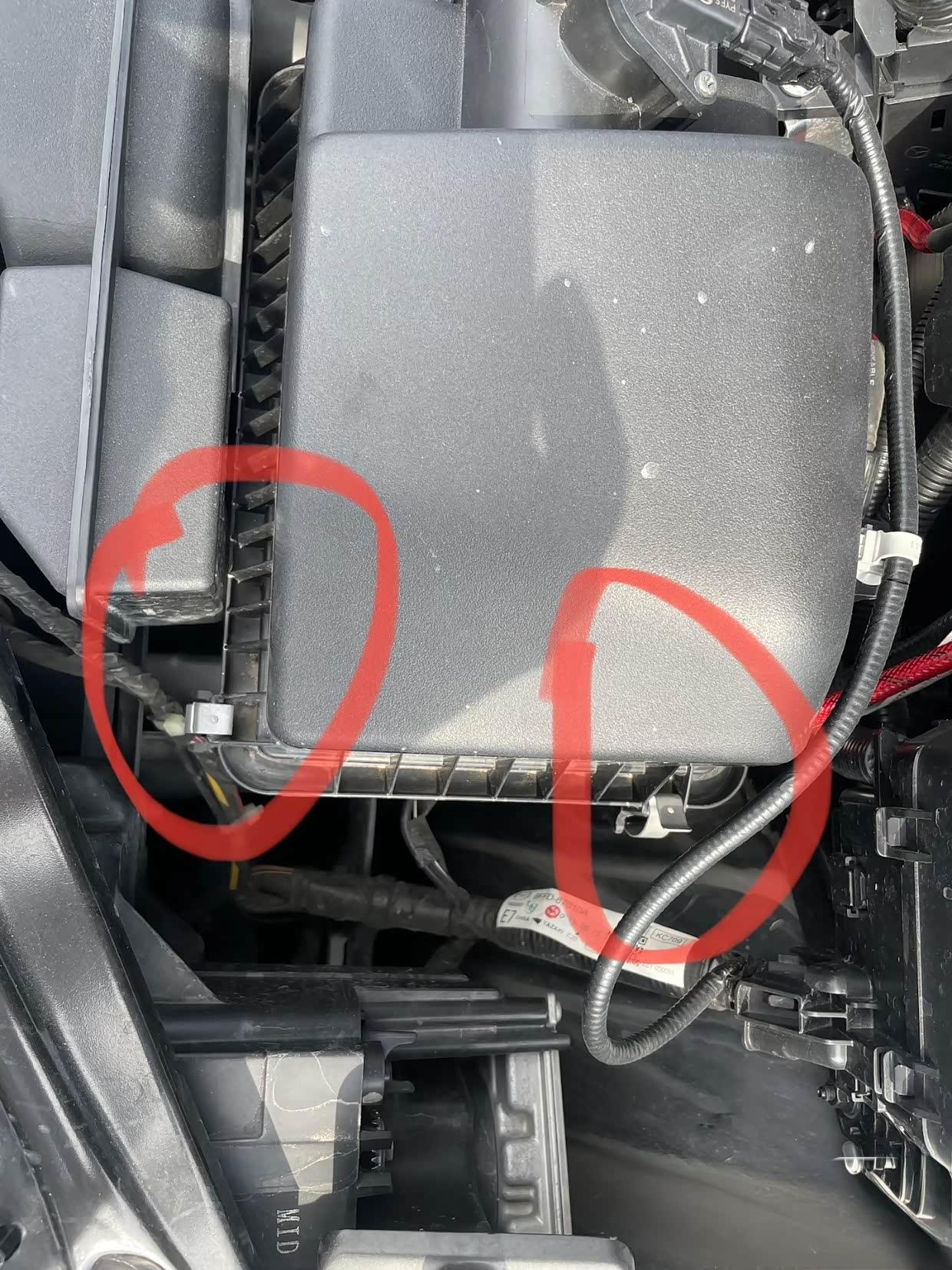 打红圈处为空气滤芯盒卡扣,掰开就可以取掉空气滤芯底盒盖板
