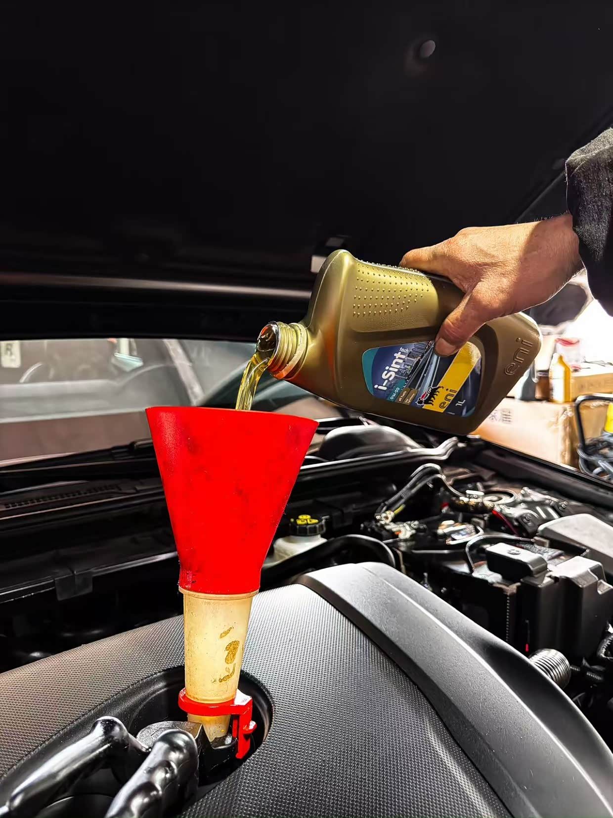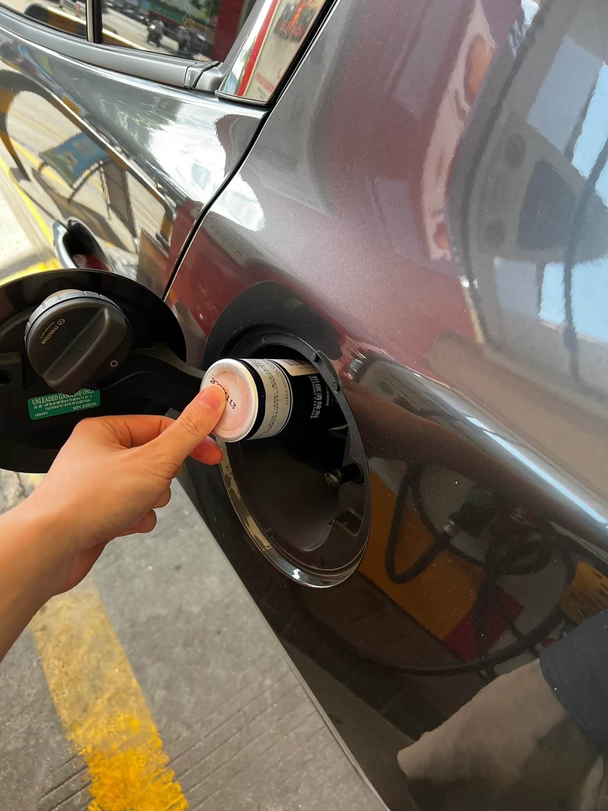 我跑到7000公里去加油站加油前,先给车子喂一瓶原厂除积碳添加剂,随后加满汽油,让汽油和添加剂充分混合并从喷油嘴喷出,这样可以清洗疏通油管、喷油嘴、活塞顶部的部分积碳。等到这箱油跑完以后便开去保养门店进行保养作业。