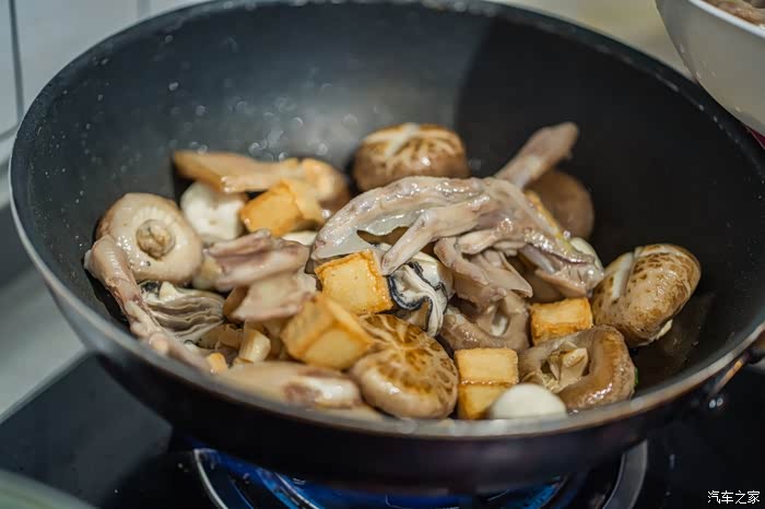 然后将鸭掌,香菇,鱼豆腐和生蚝一起下油锅翻炒,直到稍微去生为止。