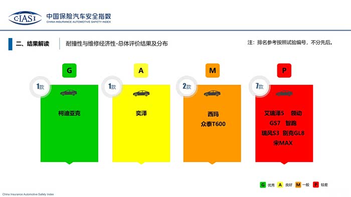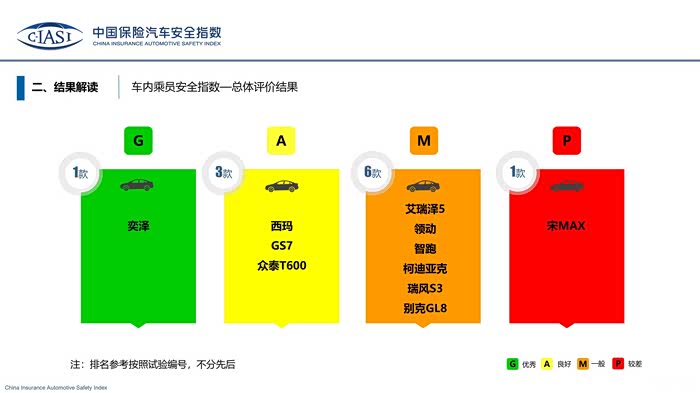 请看,得分最高的奕泽,气囊数是最多的,当然,它的结构件和闭合件得分也不低,闭合件并列第二的样子,结构件第三。而得分为A的西玛、众泰T600,除了有前排侧气帘,还有头部气帘,GS7也有前排侧气帘,其中西玛的闭合件和结构件得分也不低,仅闭合件得分略低于艾5处于第二水平,结构件得分和艾5并列第二,T600闭合件处于第二,结构件稍差处于第四,但在11款车上也算中间水平了。至于GL8,尽管气囊不少,和T600及西玛一样多,但奈何结构件得分第二低,闭合件得分也不高,所以得个M也不算冤枉它了。至于宋MAX,闭合件得分处于最低一列,结构件得分并列倒数第三,气囊只比艾5多了前排侧气囊,P的总体得分也不算偏差。