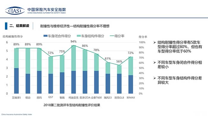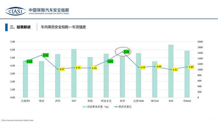 此图显示车顶强度,怎么测的?质量载荷比,简单的说就是用承载质量 /整备质量,艾5得分4.53处于第4,第一又是奕泽,所以综合得分高不是没有理由的,由此也可以说明,日系其实没并有那么不安全,起码丰田在这方面已经做得不错了。领动也不错,棒子也开始厚道了。艾5排第四,相对艾5差不多1.3吨的整备质量,这个成绩也可以接受。至于GL8和宋MAX,虽然得分不高,但考虑到整备质量本身较重,其绝对载荷承受值其实并没有想像的那么低。但是同样,这两个PPT也没说测试的具体方法。顺便说一句,大家喜欢的天窗,尤其是全景天窗,绝对是这个得分项的分数杀手。