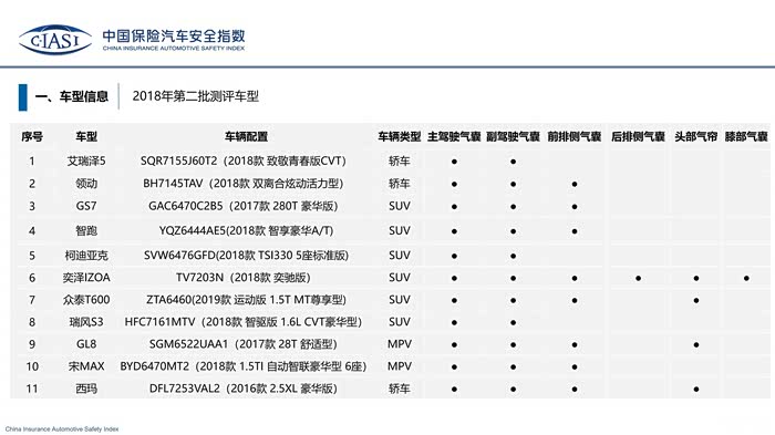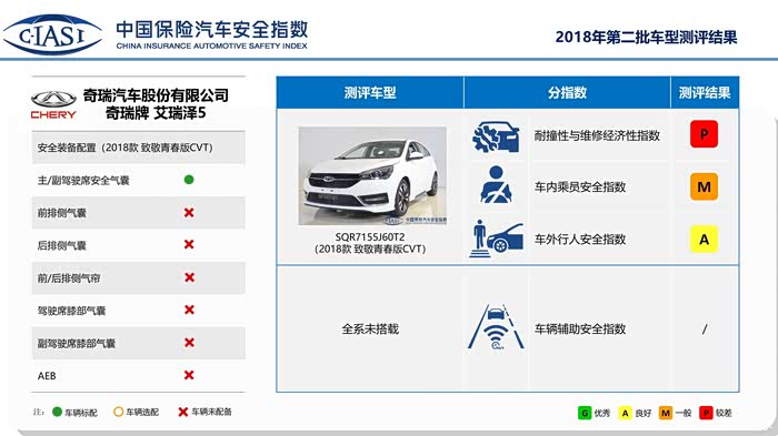 由于天气已晚,人也懒了,所以没有查中保研碰撞报告上的全部车型,但是这些数据基本上也已经有代表性了,各位,看到了什么?所有车型,只有艾5,是最低配版本。在我列出的车型里,艾5的价格最低,官方指导价,比以便宜出名的众泰还低3万多,经销商指导价,低2万8近3万。也因此,艾5在所测车型里,气囊数是最少的(之一)辅助安全得分为“0”。为了更直观的展示,接下去我会用中保研官方PPT,一个个来分析。