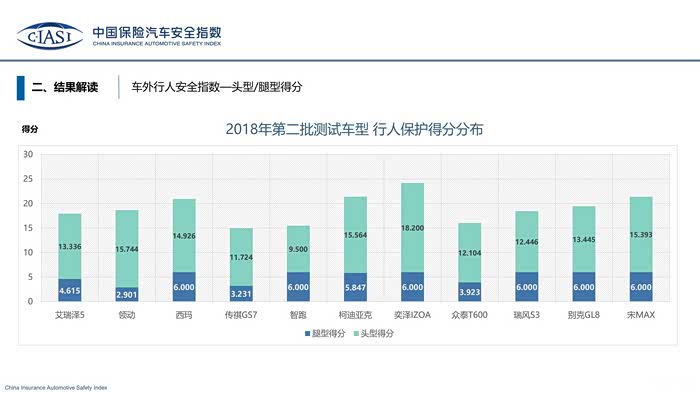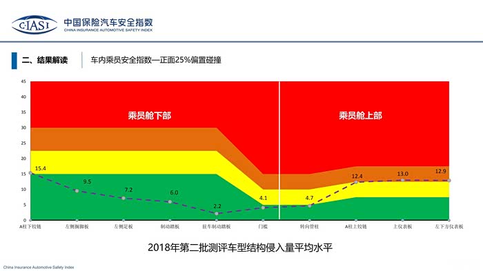 说到侧碰了,就把图放上吧,可以看到,由于最低配已经有天窗,所以车顶横向强度不足,车顶上拱,导致B柱凹陷更厉害,这进一步降低了上图得分。而25偏碰,可以看到A柱无明显变形,无断裂。那么此时决定得分高低的就是乘员舱腿部空间的侵入水平了,可惜这部分中保研没有给出各车分值,只拿出了一个总的统计表,见下图