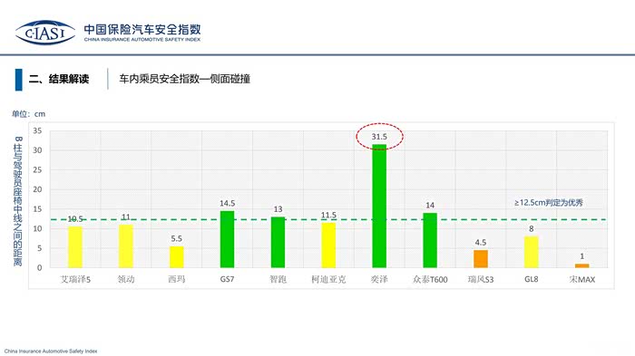 侧面碰撞,这个指标显示的是侧碰后B柱内陷后与驾驶员座椅中心线之前的距离,可以看到,最安全的奕泽得分最高,说来也巧,就刚刚吃好饭的功夫,我有幸小小体验了一把奕泽,(我一个堂叔新换的,牌都还没上)这本总体上属于跨界车,运动风格,溜背,车内空间不大,特别是头顶空间比较小,我178坐在驾驶位上,头部所余不多,但因为底盘高,所以整车高度也有1565,车不是很宽和我破三差不多,应该稍宽点,车内感觉没有破三宽,门做得厚度不错,B柱应该用上热成型钢了,毕竟这个价位了,落地20万。众泰在这个环节同样表现不错,智跑和GS7在上面一个图表中得分处于中间位置,在这项表现不错,所以GS7得分为A,智跑得到M有点意外,艾5在这项上属于中间水平,昨晚特地百度了一张艾5的车身结构图,车身钢材用三种颜色标注,灰色属于普通强度,黄色应该属于高强度,红色属于超高强度,但没有看到奇瑞习惯标注热成型钢的紫色,而且 也不知道这图是不是官方的,所以也就不放上来了,但是考虑到5、6万的售价,艾5不使用热成型钢也可以理解,再高一级的艾7B柱是肯定使用热成型钢的,官方有宣传,而艾5宣传只是重点宣传了3R-BODY车身。