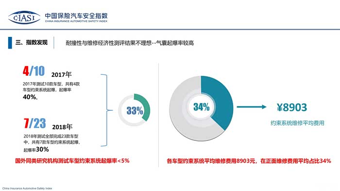 保险公司利益至上的嘴脸表露无疑:气囊爆了,要修了,保险公司出血了,所以,维修经济性差了!但是,同志们,气囊不应该爆吗?对此中保研表示,低速正面碰撞中,气囊起爆率较高。那么问题来了,低速,是多低的速度?对此我百度了一下,发现一段文字:“对此,业内汽车专家指出,安全气囊在何种速度、多大撞击力的情况下起爆,行业并无具体规定。由于缺乏统一标准,各品牌制造厂家通常都会给出“角度不对”、“速度不够”、“没有撞到撞击点”等并非车辆质量问题的理由。”好了,没有标准!所以,对中保研来说,在不死人的撞击速度下,最好不要爆?那么问题来了,中保研是以多少速度做的正面碰撞?有没有依据?如果在测试速度下,气囊不应该起爆,那么为什么有四款车型起爆了?抛开利益,我是不是也可以认为,只有这四款车是安全的,另几款未爆的才不安全?