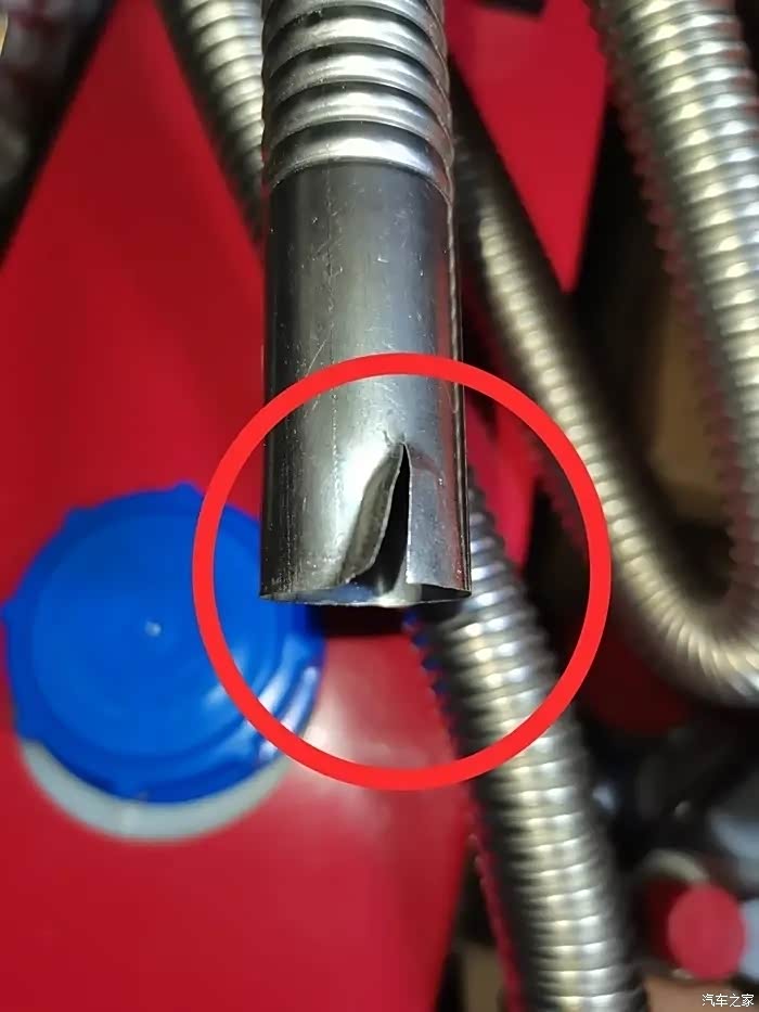 拆下来的铝箔管这个位置已经吸扁了一半,导致进气量不足燃烧不充分。